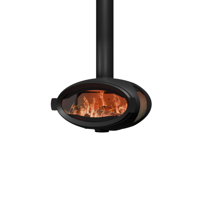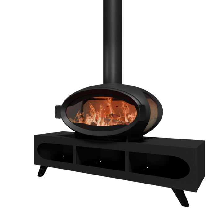 Deze haard kan aan de muur hangen, leverbaar op een poot of leverbaar op 2 verschillende onderstellen.