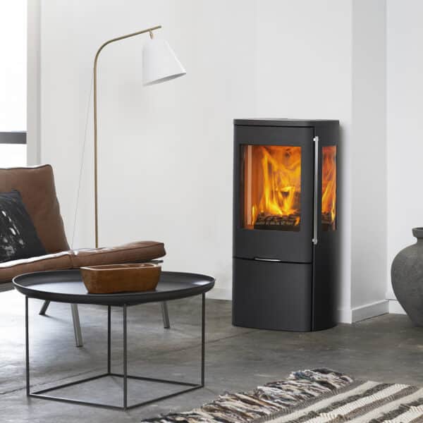 Onze houtkachel; Jydepejsen Senza 3 met zijruiten in de grijze uitvoering mag de showroom verlaten.
