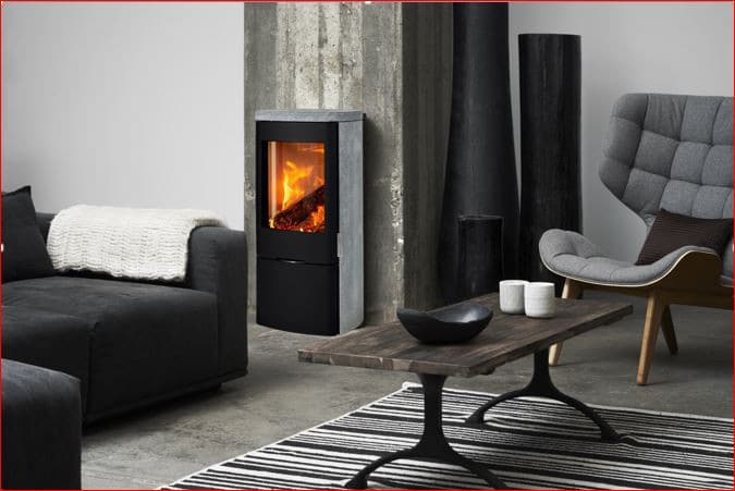 Deze houtkachel met speksteenbekleding mag de showroom verlaten;